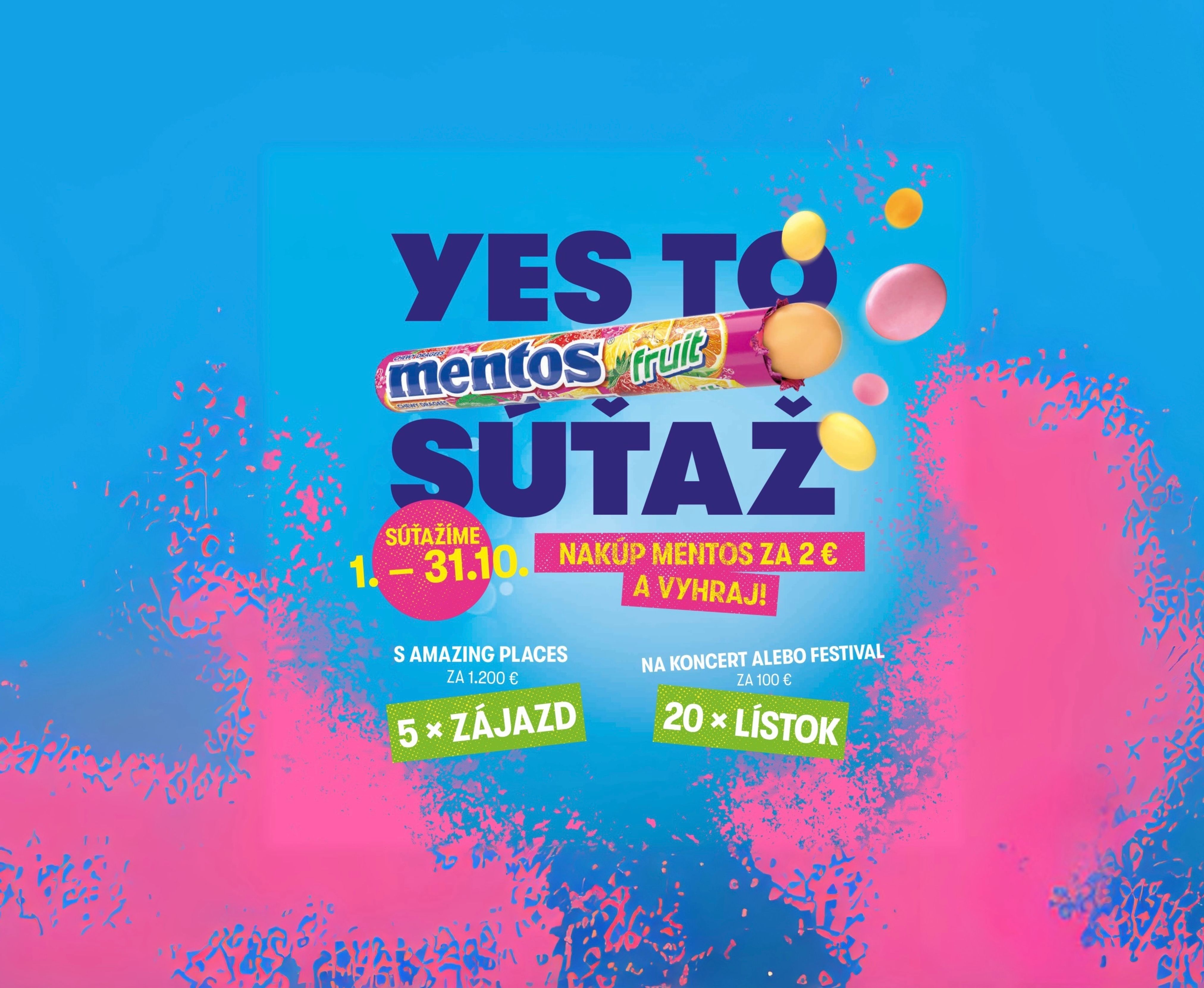 Kúp Mentos za 2 € a vyhraj fantastické zážitky! Celý október súťažíme o voucher na zájazd alebo vstupenky na festival. Jeden malý nákup, jedna veľká šanca na super dobrodružstvo. Povedz YES TO SÚŤAŽ a premeň sviežosť na výhru, ktorá ťa vystrelí z každodennej rutiny.